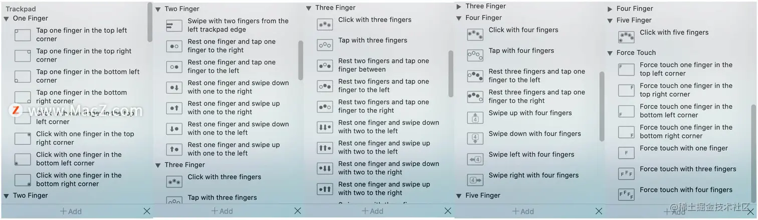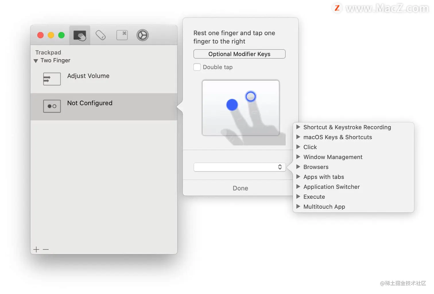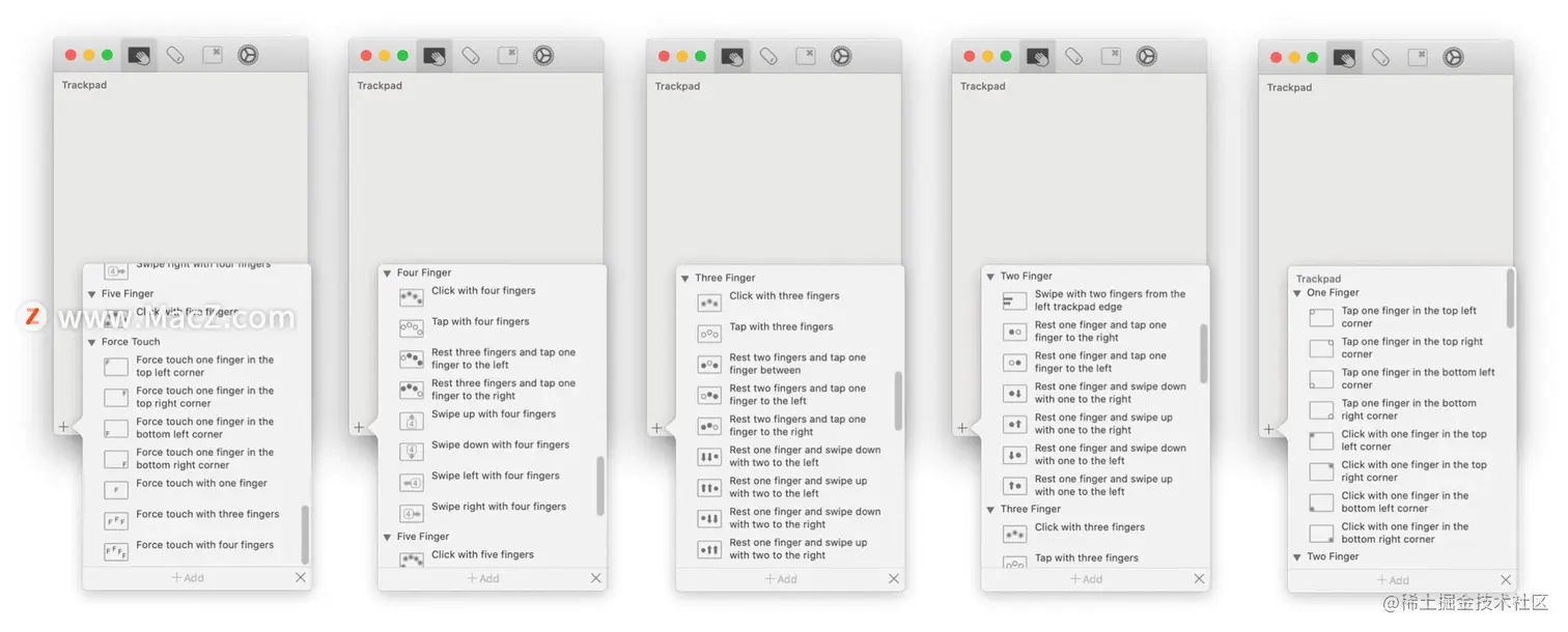 Multitouch 的设置非常 easy,打开界面,点击左下角的加号即可添加各种动作,建议你先从一指的动作慢慢熟悉,在添加动作的时候软件会提示你新建动作是否与 macOS 自带 trackpad 手势冲突,如果冲突建议你采取其他动作即可。