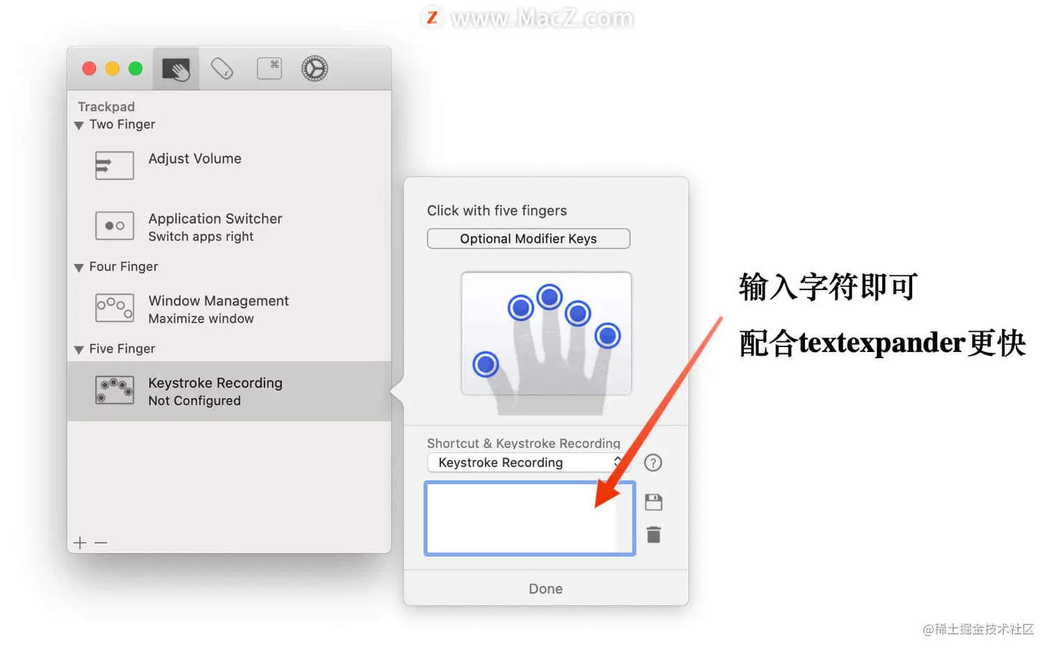 五指动作,我选择了输入 keystroke recording,也就是你做了动作后会输入你提前录制好的按键字符,这个设计特别适合于 Text Expander 使用,你可以将 TE 的 snippet 字符敲进去,然后当你做完 trackpad 动作后会自动触发 TE 执行文本扩展,这样的好处不言而喻,你都省去了手动输入 snippet 字符的步骤,直接用手势代替即可。