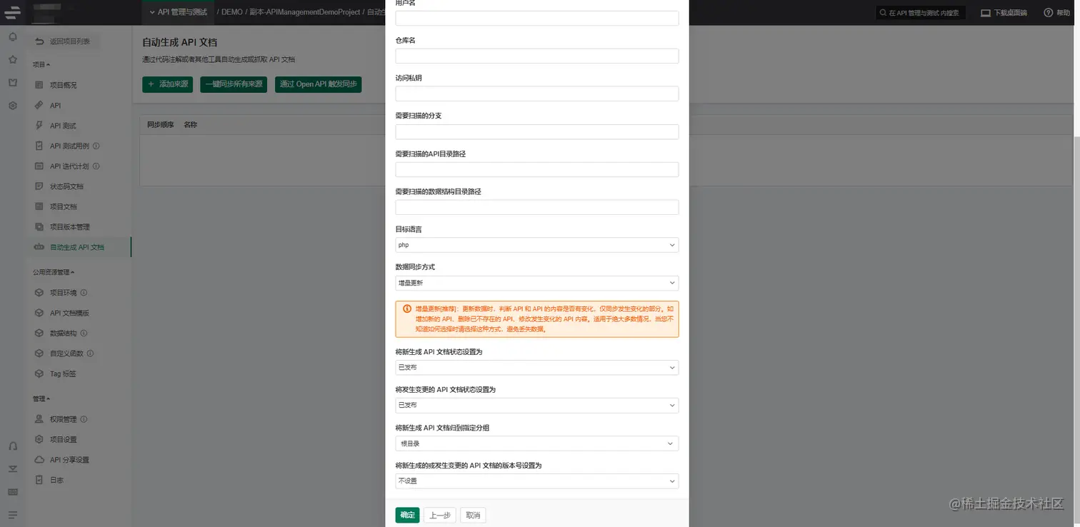 在选择集成时,Eolinker支持多种方式更新API文档,“增量更新”、“全量更新”、“仅添加API文档”,可根据使用场景进行不同的集成。