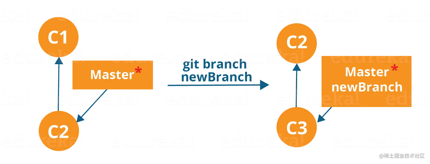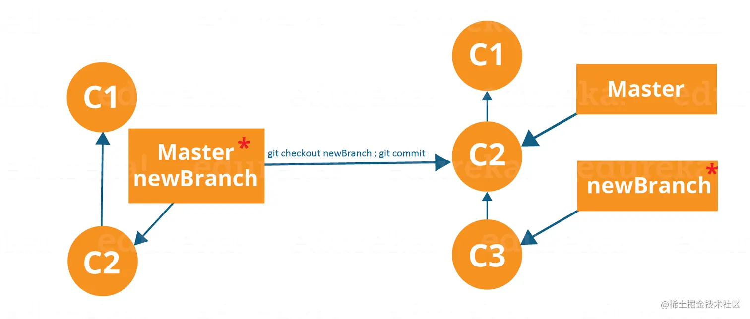 分支包括特定提交和所有父提交的工作。如您在上图中所看到的,newBranch 已与主服务器分离,因此将创建一条不同的路径。 使用以下命令: git checkout <branch_name> 然后执行 git commit