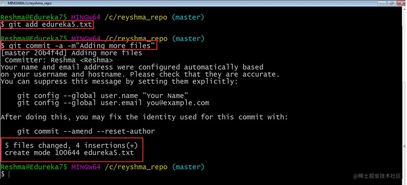 该命令将提交工作目录中所有更改的快照,但仅包括对跟踪文件的修改,即在历史记录中的某个时刻使用 git add 添加的文件。因此, edureka6.txt 尚未提交,因为尚未将其添加到索引中。但是会提交对存储库中所有先前文件的更改,即 edureka1.txt、edureka2.txt、edureka3.txt、edureka4.txt 和 edureka5.txt。