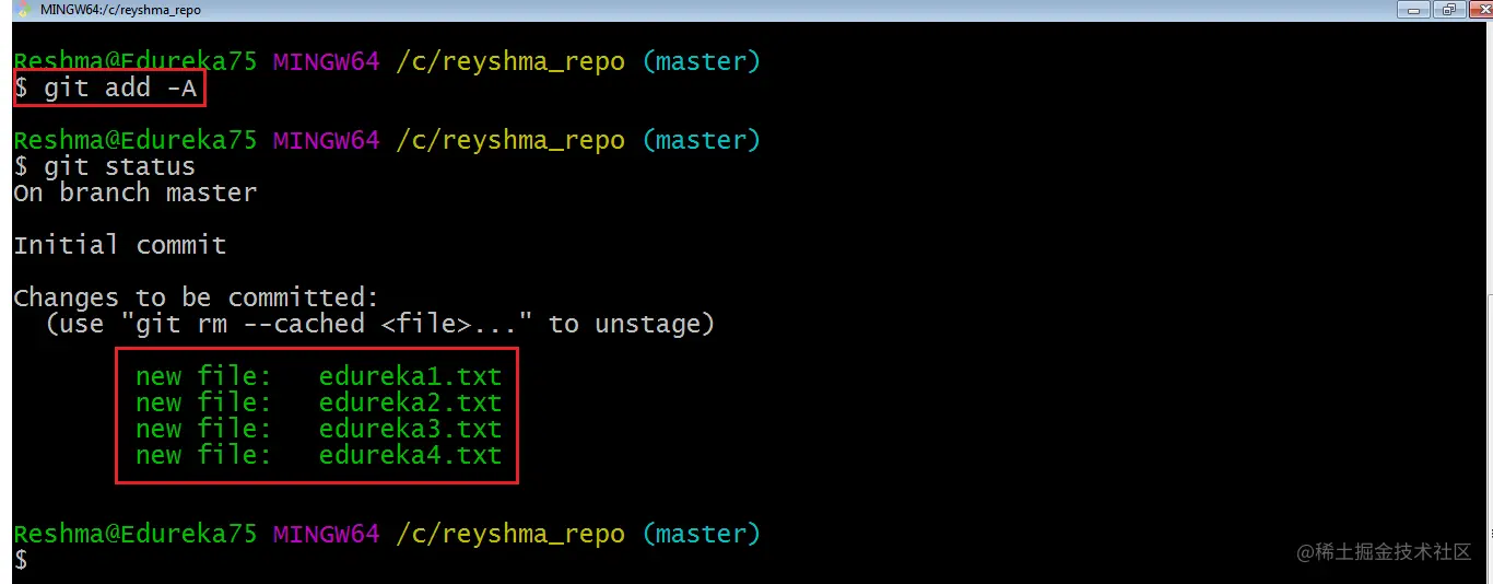 我还创建了两个文件 edureka3.txt 和 edureka4.txt。让我们使用命令 git add -A 添加文件。此命令会将所有目录中的文件添加到索引中,但尚未在索引中更新。