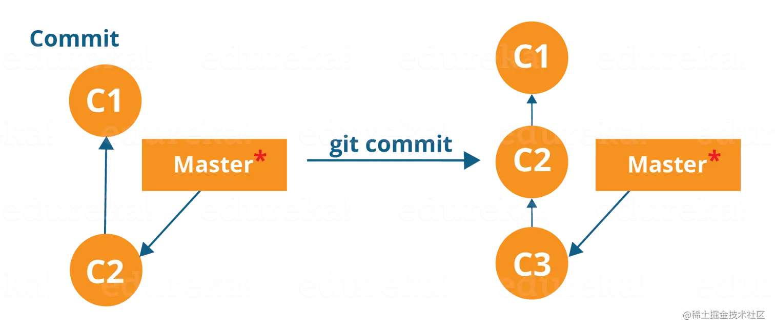 这里,C1 是初始提交,即第一个更改的快照,从该更改创建另一个名为 C2 的快照。请注意,主节点指向最新的提交。