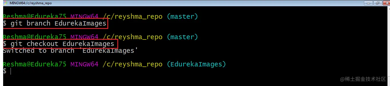 在这里,我创建了一个名为“** EdurekaImages**”的新分支,并使用命令 git checkout 切换到该新分支。 上述命令的一种快捷方式是: git checkout -b[ branch_name] 此命令将创建一个新分支并同时签出新分支。 现在,当我们在分支 EdurekaImages 中时,使用以下命令添加并提交文本文件 edureka6.txt: git add edureka6.txt git commit -m "adding edureka6.txt"