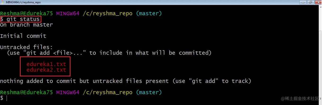 现在我的存储库已初始化,现在让我在目录/存储库中创建一些文件。例如我创建了两个文本文件,即 edureka1.txt 和 edureka2.txt。