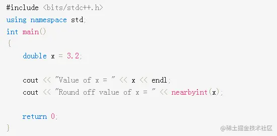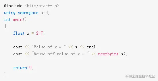 在cmath头文件中定义了nearint()函数。此函数使用当前的舍入方法将给定值四舍五入为附近的整数值。当前的舍入方法由fegetround描述。
