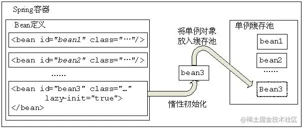 Bean对象实例化过程是在Spring容器初始化时被实例化的,但也不是不可改变的,可以通过 lazy-init="true" 属性延迟bean对象的初始化操作,此时再调用getBean 方法时才会进行bean的初始化操作