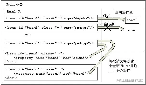 通过scope="prototype" 设置bean的类型 ,每次向Spring容器请求获取Bean都返回一个全新的Bean,相对于"singleton"来说就是不缓存Bean,每次都是一个根据Bean定义创建的全新Bean。