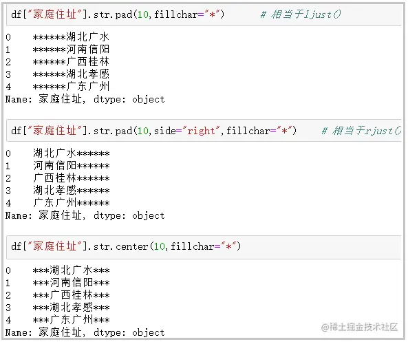 df["家庭住址"].str.pad(10,side="right",fillchar="*") # 相当于rjust()