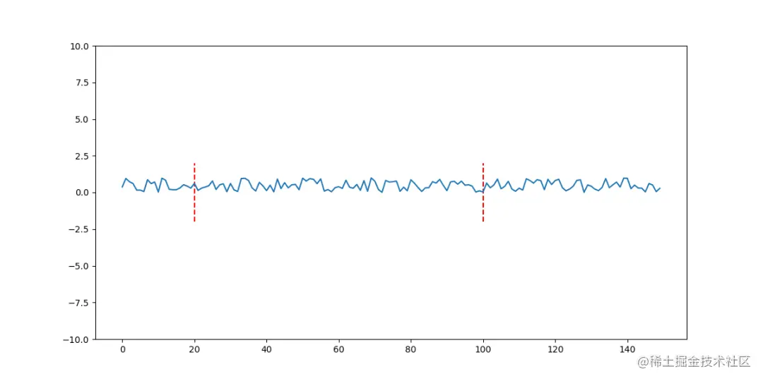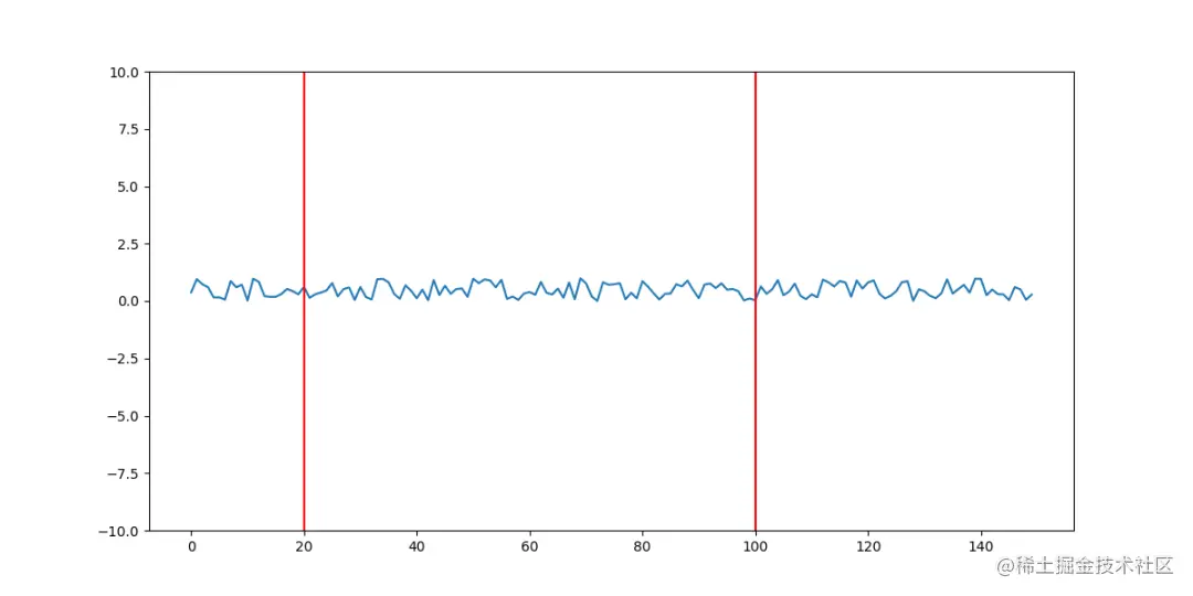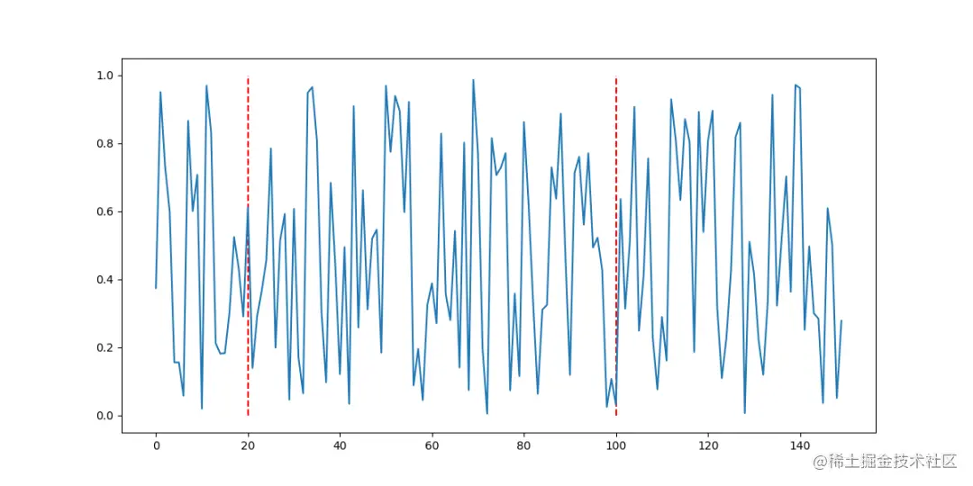 现在,由于我们已经设置了 seed ,因此我们可以根据需要多次复制此随机图像。例如,我们可以在20和100标记上绘制垂直线。