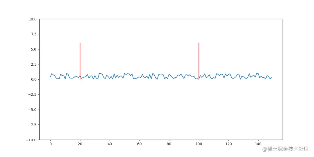 vlines()函数接受一些参数:“即您想在其上绘制线条的标量或X值的一维数组。我们提供了[20,100],标记了两个点,尽管您可以从0..n点开始。然后,ymin和ymax参数:这些是线条的高度。我们将它们设置为0到1,因为这也是np.random.rand()调用的分布。然后,您可以设置接受典型Matplotlib样式选项的样式,例如线型或颜色。