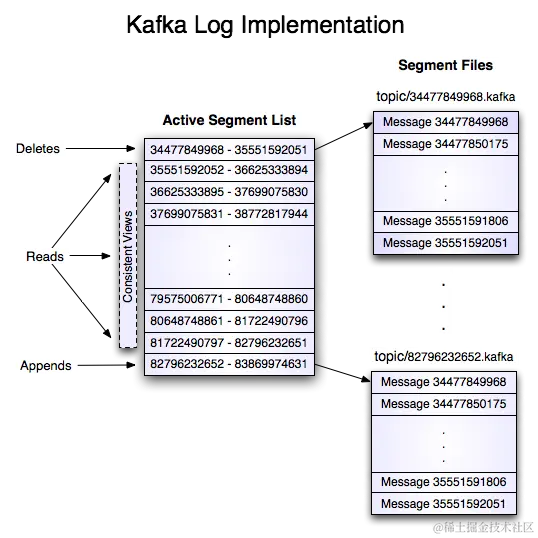 如果一个topic的名称为"my_topic",它有2个partitions,那么日志将会保存在my_topic_0和my_topic_1两个目录中;日志文件中保存了一序列"log entries"(日志条目),每个log entry格式为"4个字节的数字N表示消息的长度" + "N个字节的消息内容";每个日志都有一个offset来唯一的标记一条消息,offset的值为8个字节的数字,表示此消息在此partition中所处的起始位置..每个partition在物理存储层面,有多个log file组成(称为segment).segment file的命名为"最小offset".kafka.例如"00000000000.kafka";其中"最小offset"表示此segment中起始消息的offset.