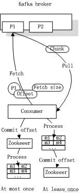 at least once: 消费者fetch消息,然后处理消息,然后保存offset.如果消息处理成功之后,但是在保存offset阶段zookeeper异常或者consumer失效,导致保存offset操作未能执行成功,这就导致接下来再次fetch时可能获得上次已经处理过的消息,这就是"at least once".