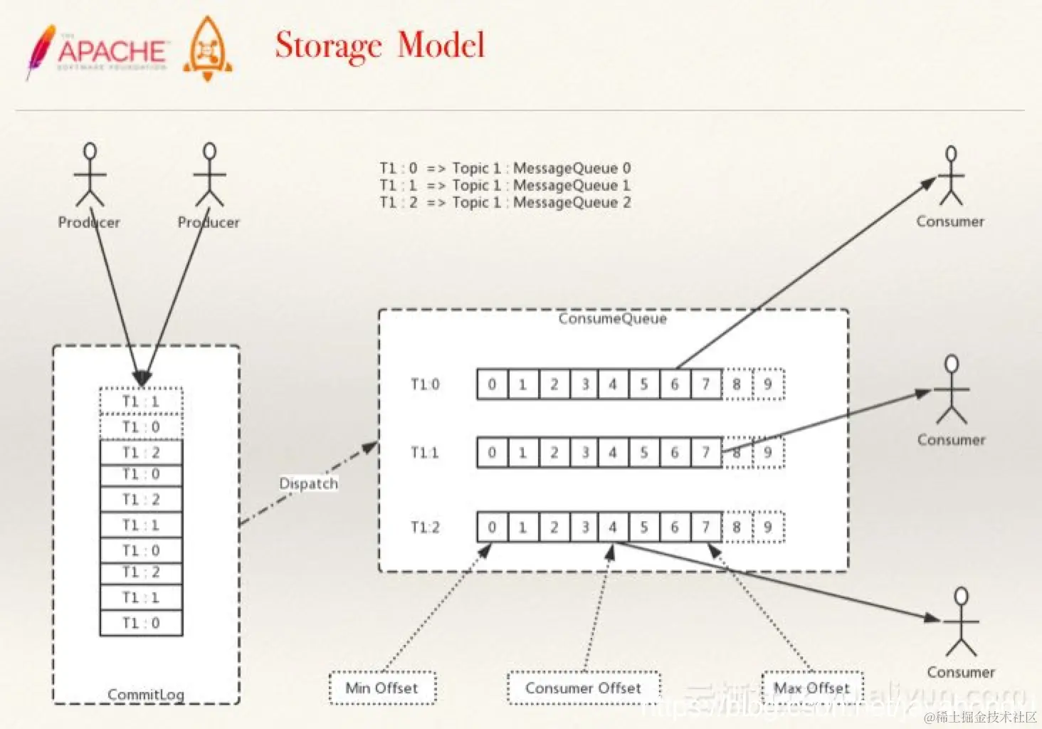 - CommitLog:是消息主体以及元数据的存储主体,对CommitLog建立一个ConsumeQueue,每个ConsumeQueue对应一个(概念模型中的)MessageQueue,所以只要有 CommitLog在,ConsumeQueue即使数据丢失,仍然可以恢复出来。