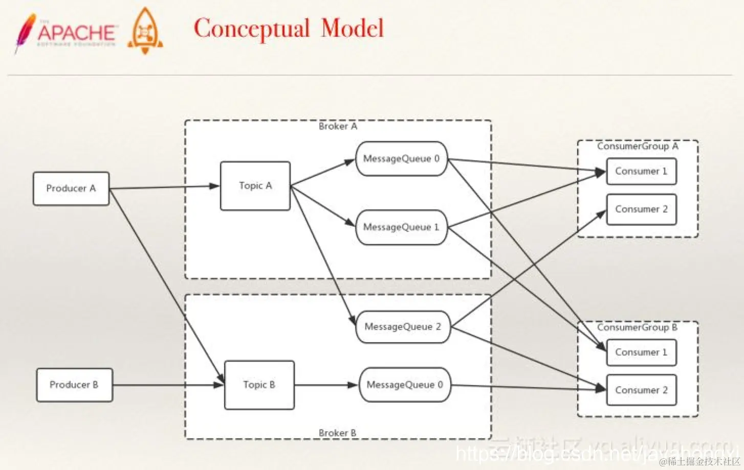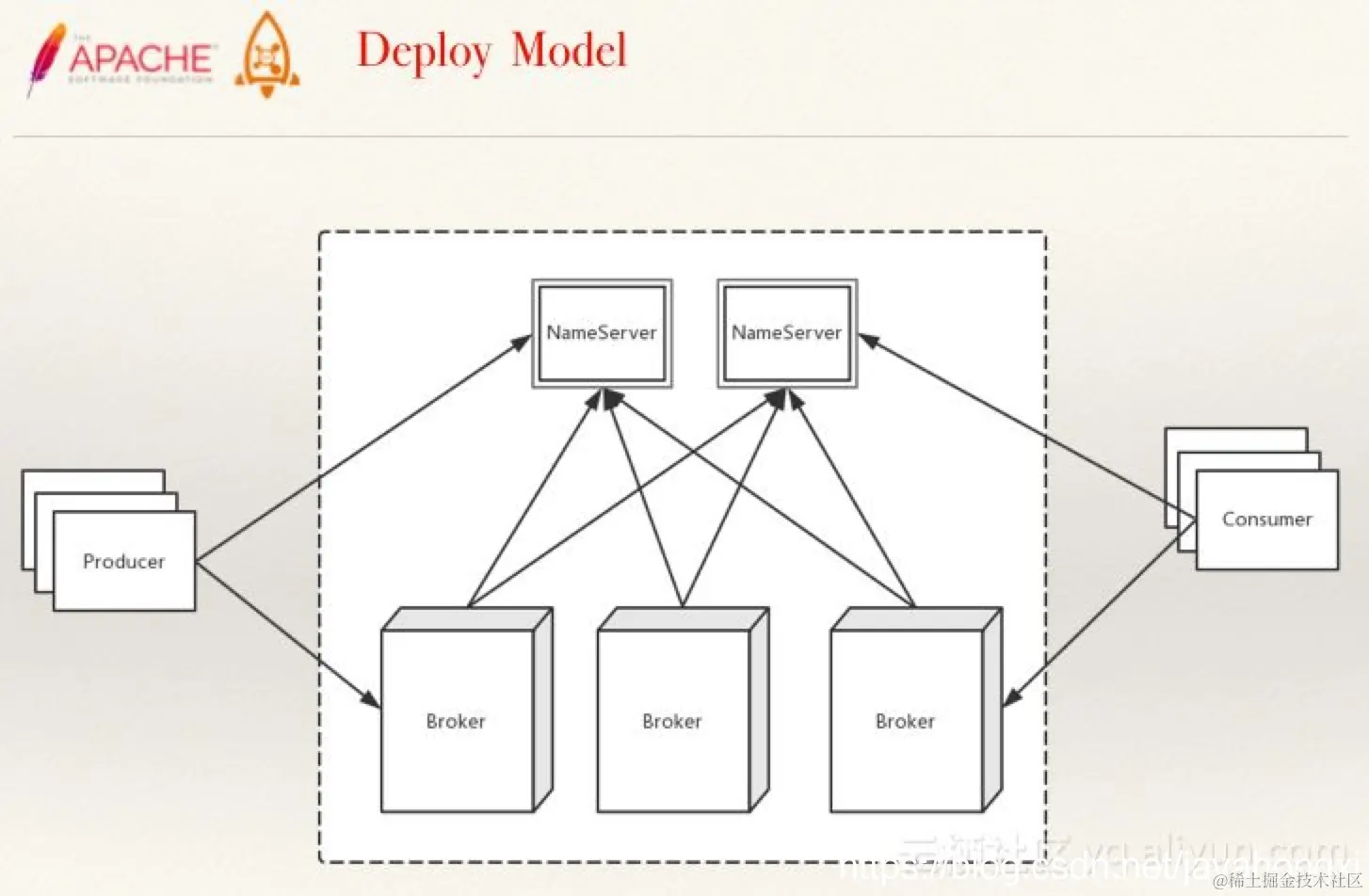 Broker上存Topic信息,Topic由多个队列组成,队列会平均分散在多个Broker上。Producer的发送机制保证消息尽量平均分布到 所有队列中,最终效果就是所有消息都平均落在每个Broker上。