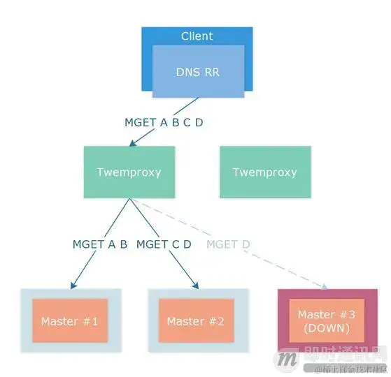 当集群中 Master 节点宕机,按照单机模式下的高可用流程进行切换,Twemproxy 在连接断开后会进行重连,对于存储模式下的集群,我们不会设置 auto_eject_hosts, 不会剔除节点。