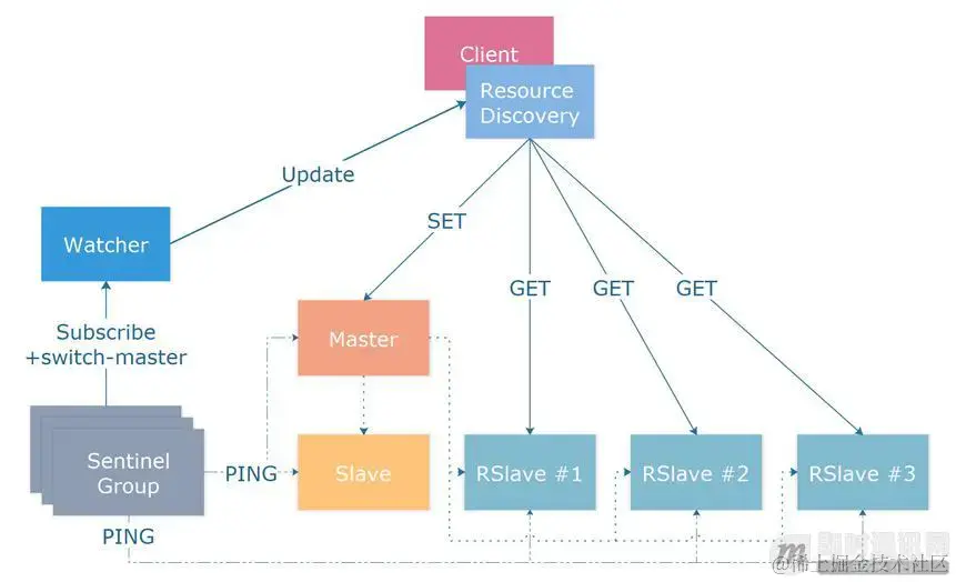 watcher 监听到消息后,会去主动更新资源发现策略,将客户端连接指向新的 Master 节点,完成 Failover,具体 Failover 切换过程详见 Redis 官方文档(Redis Sentinel Documentation - Redis)。