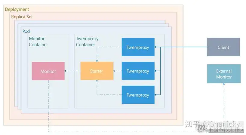 同一个容器内由 Starter 启动多个 Twemproxy 实例并绑定到同一个端口,由操作系统进行负载均衡,对外仍然暴露一个端口,但是内部已经由系统均摊到了多个 Twemproxy 上。