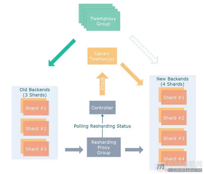 等待 RDB 转发完成后,我们按照新的后端生成新的 Twemproxy 配置,并按照新的 Twemproxy 配置建立 Canary 实例,从上游的 Redis 后端中取 Key 进行测试,测试 Resharding 过程是否正确,测试过程中的 Key 按照大小,类型,TTL 进行比较。