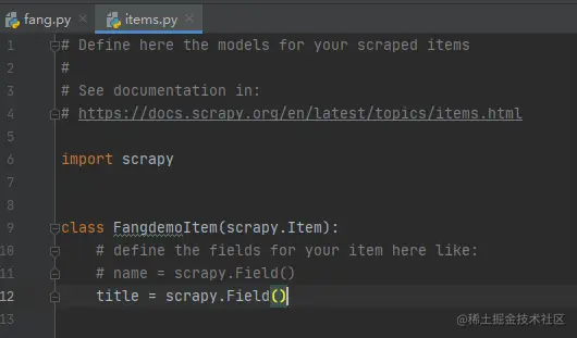 当你按照上面的操作,之后你就会发现,在spiders文件夹下就会出现fang.py这个文件。这个就是我们的爬虫文件。