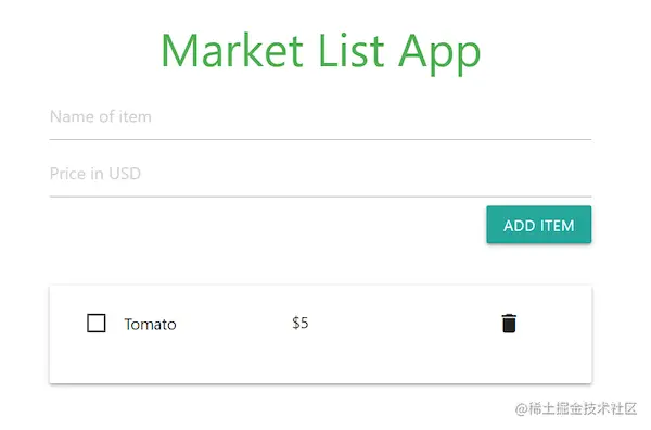 对于我们的演示项目,我们将使用Dexie.js和React构建一个市场列表应用程序。我们的用户将能够在市场列表中添加他们打算购买的商品,删除这些商品或将其标记为已购买。