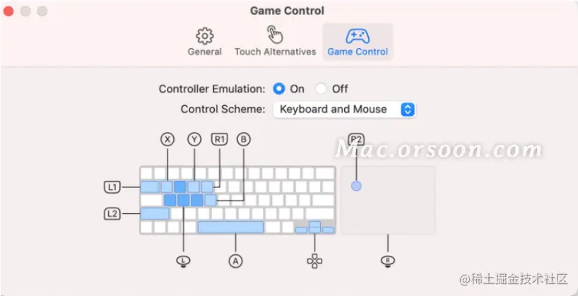当运行 iPhone 或 iPad 应用时,打开偏好设置会出现一个触摸替代和游戏控制界面,可以用来让基于触摸的 iPhone 和 iPad 应用在 Mac 控制下运行得更好。