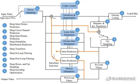 采样深度神经网络可以替代传统视频编码中的模块包括:帧内/帧间预测、变换、上下采样、环路滤波、熵编码等。