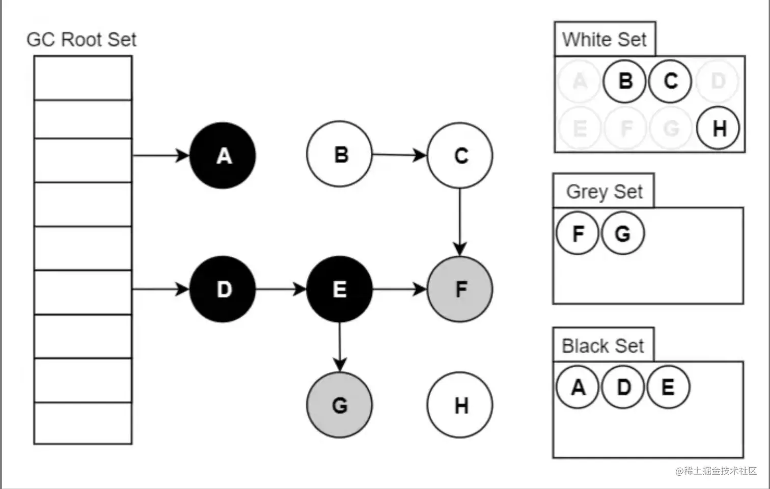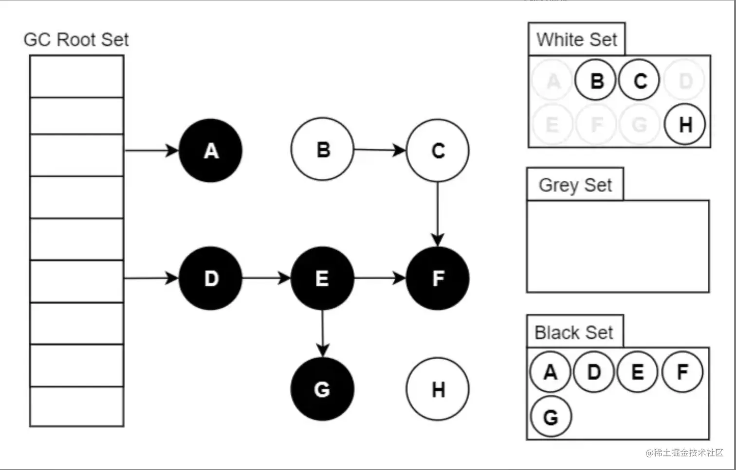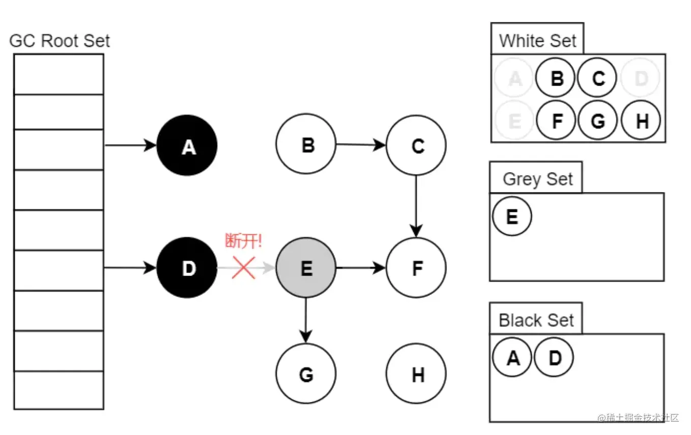 此时切回GC线程继续跑,因为E已经没有对G的引用了,所以不会将G放到灰色集合;尽管因为D重新引用了G,但因为D已经是黑色了,不会再重新做遍历处理。