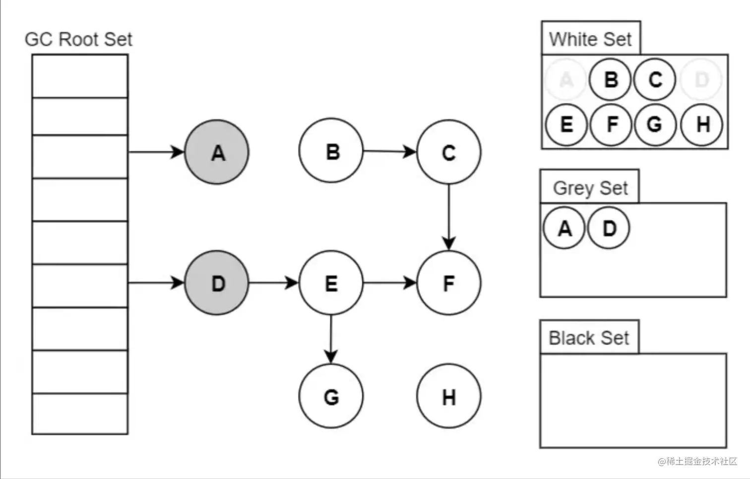 - 将GC Roots 直接引用到的对象 挪到 【灰色集合】中;
