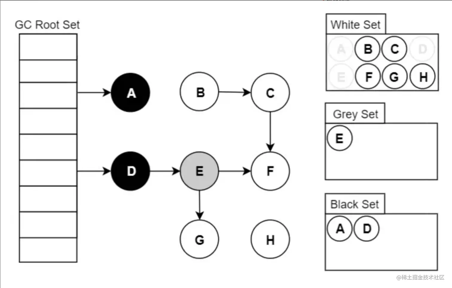 假设已经遍历到E(变为灰色了),此时应用执行了 objD.fieldE = null :