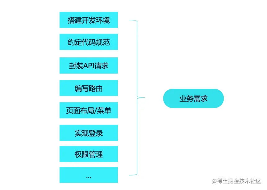 我们需要开发的大部分前端应用的业务比较类似,比如中后台应用大多都是工作台、增删改查、权限、图表等。所以在开发一个前端应用之前,除了环境准备工作,还需要处理这些基础的业务逻辑。