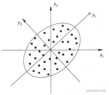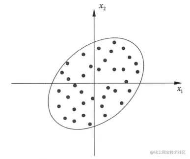 上图中,x1,x2为线性相关,即x1确定时,x2不是随机分布的。就好比一个人的身高和体重,两维数据存在互相影响。这时候我们希望==通过原基向量线性组合组成新的基向量,将数据以新基向量表示,从而使信息集中在前K维度上,达到降维的目的==。