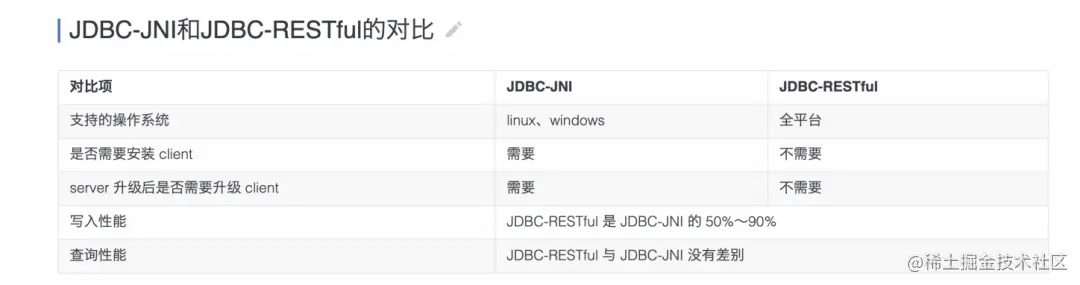 唯一不方便的是JDBC的方式则会强依赖本地库函数,需要在客户端的机器上也安装TDengine,这样在项目部署阶段会稍微麻烦一些,不过整体来说是利大于弊的。
