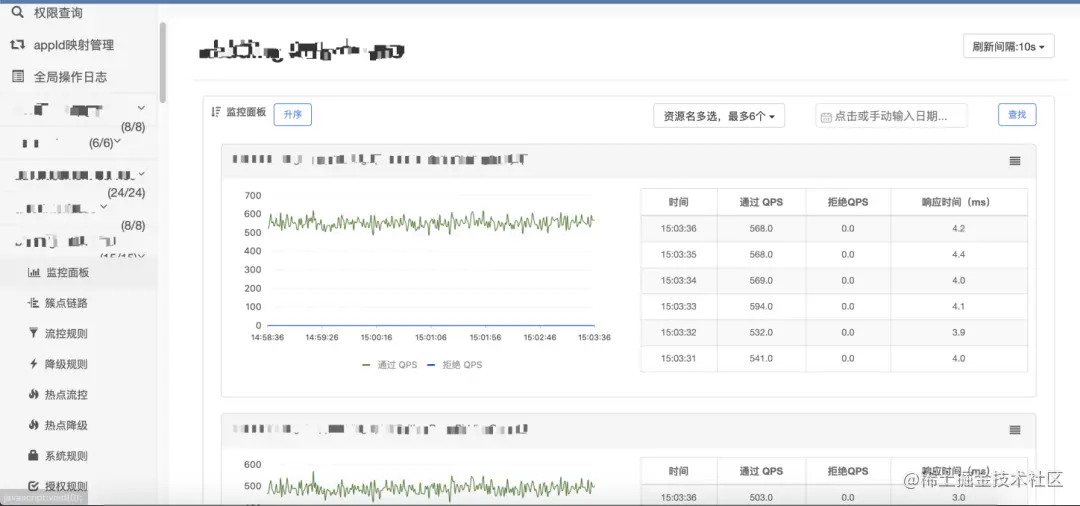 从上图中可以看出,左侧是应用列表,在每个应用的菜单中有独立的监控面板,在监控面板中又以资源的粒度,统计了所有资源的流量数据,例如通过QPS、拒绝QPS、响应时间等。