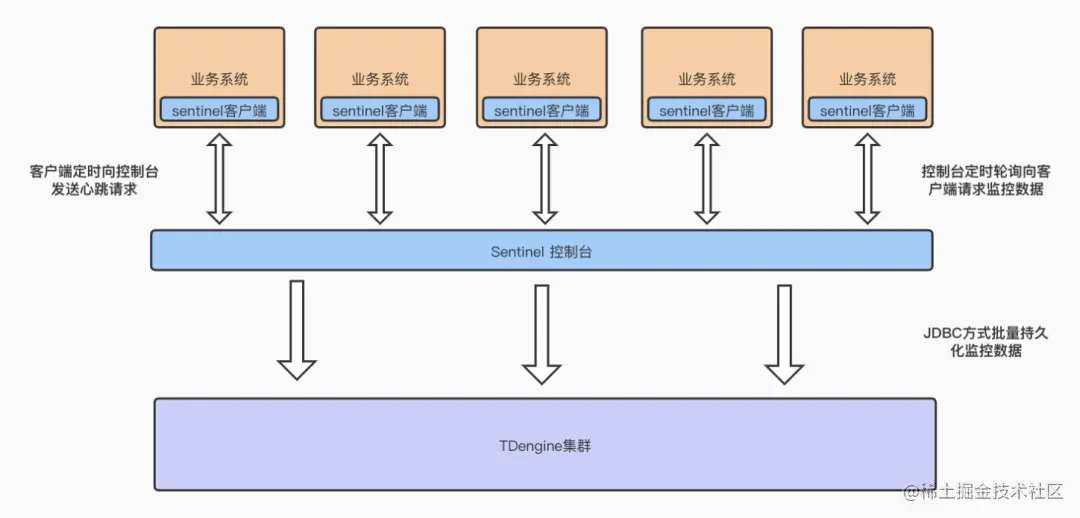 而控制台会定时轮询所有机器,拉取Sentinel客户端在业务系统中记录的监控数据,经过聚合处理后再向TDengine集群批量写入。