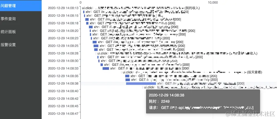 有些异常事件的发生并不只涉及一次用户操作或接口请求,而可能是异常发生之前的接口超时引起的或者某个特定的操作系列导致的报错。因此对于当前报错之前的用户操作或请求以及请求耗时也需要进行收集,帮助快速定位问题。