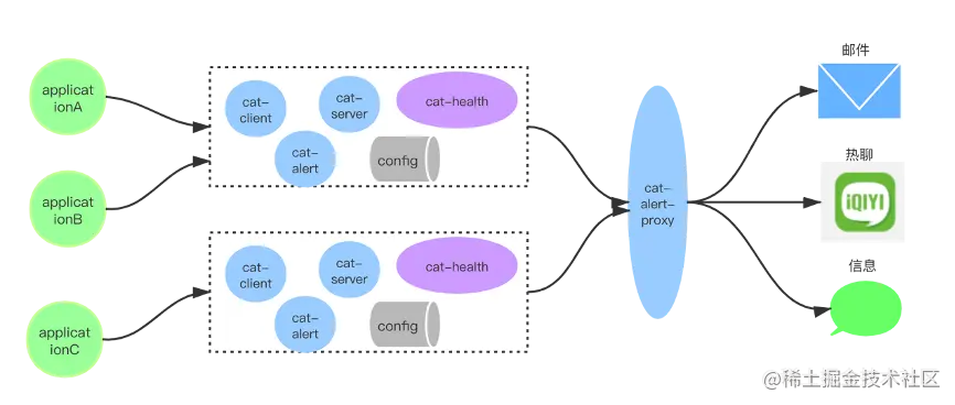 此外,在原有开源CAT告警方式基础上,结合爱奇艺自有的告警体系,我们将两者进行了融合对接,通过整合完备了整个监控系统的告警体系,支持以爱奇艺邮件、热聊、短信的方式进行对异常、健康、业务等各方面的告警发送,大大提高了告警信息的触达率,使异常实时可见,及时处理和恢复。