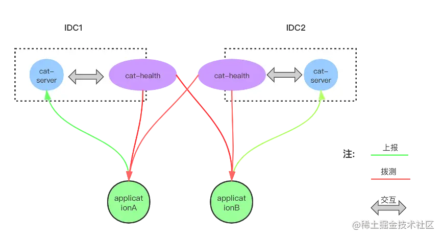 CAT的各项监控功能已经非常全面,但是却没有应用健康的监控,监控的方式是由客户端进行数据上报,当服务宕机时,业务不可用时往往就会停止数据上报,但是CAT目前无法检测到这种客户端宕机异常,所以我们对原生CAT进行了升级,加入cat-health健康检查模块到CAT系统中,通过CAT配置健康检查,以及客户端上报的应用信息,健康检查模块会定时从不同机房拨测应用来检测应用的健康状况,如果多次反复检测到应用异常,会根据一定的判定规则进行告警通知,通过新建健康检查模块填补了原生CAT监控的空白。具体如图4所示????