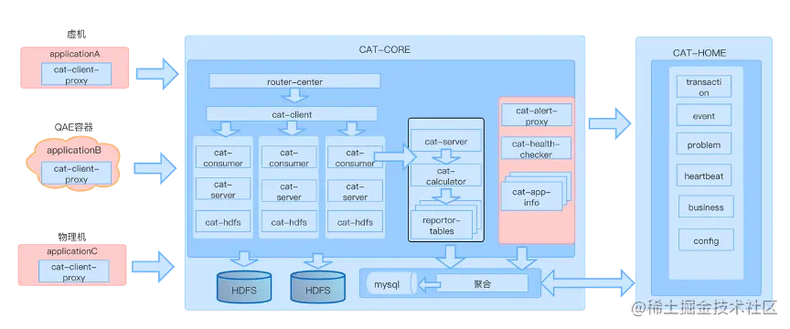 主要流程是cat-client-proxy收集监控配置,与服务端建立连接,通过读取需要监控的项的配置,对要监控的数据进行上报,上传到CAT服务端后对于原始数据处理、聚合、告警等。