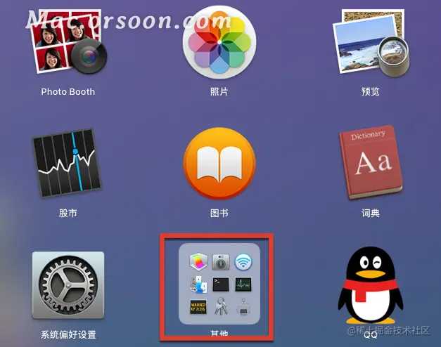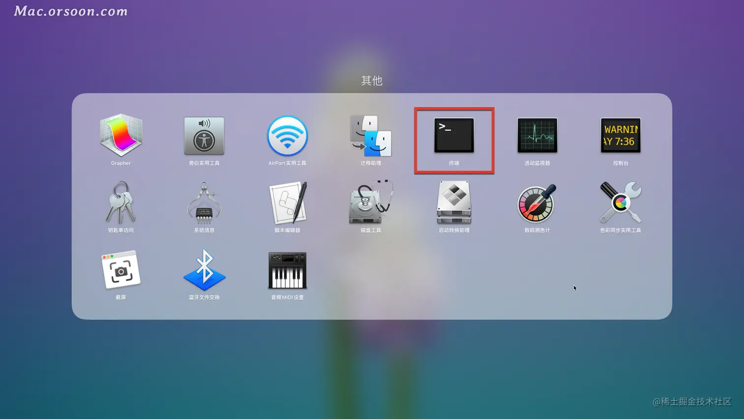 “终端”,你可以在启动台中找到“其他”点开后,找到终端,点击即可启动。也可以通过聚焦搜索,快速启动“终端”。通过快捷键 Comman+空格 输入终端 后回车启动。