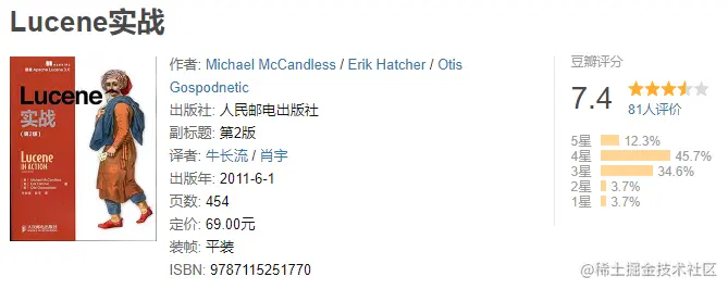 - 推荐理由 2:翻译作者是极客时间数学课的作者:黄申博士,翻译还可以,至少比《 Lucene 实战 》翻译好 100 倍。