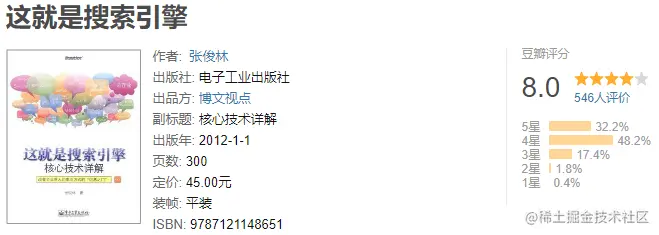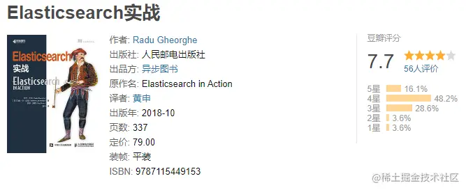 - 推荐原因:市面上写Elasticsearch 源码的唯一一本书,豆瓣评分7.5+。