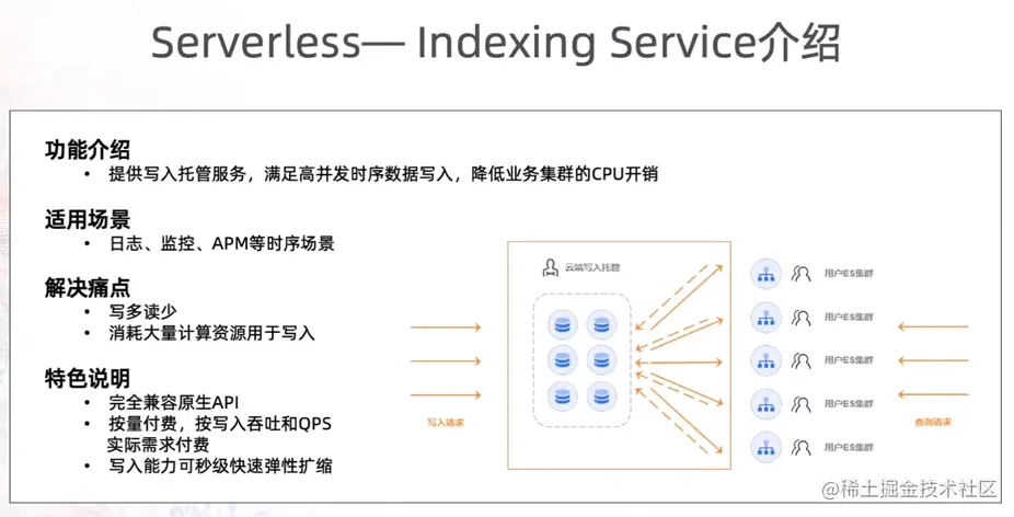 一句话概括Indexing Service 本质:写入托管服务,也就是说:针对时序、日志场景数据,用户无需再关系写入细节、写入优化、运维等操作,全权由阿里云托管搞定。