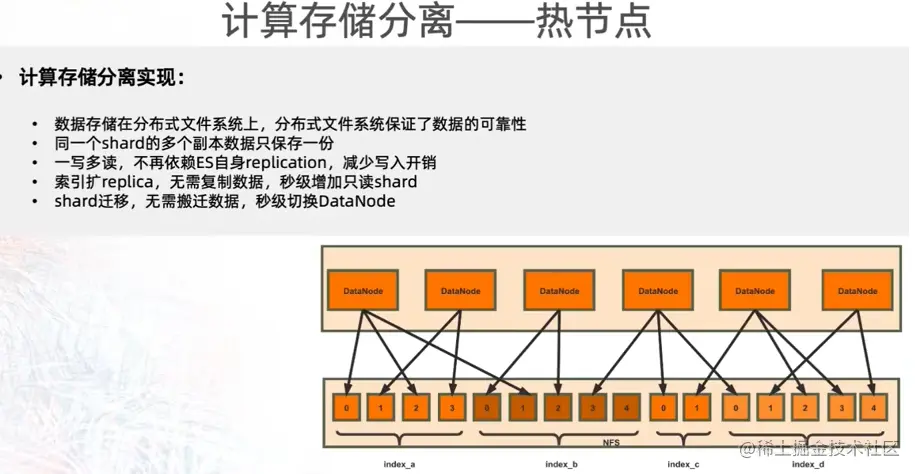 热节点计算存储分离的本质是:不再需要分片的副本保证数据的高可靠性(原生 ES 需要),而是借助:分布式文件系统保障数据的可靠性。