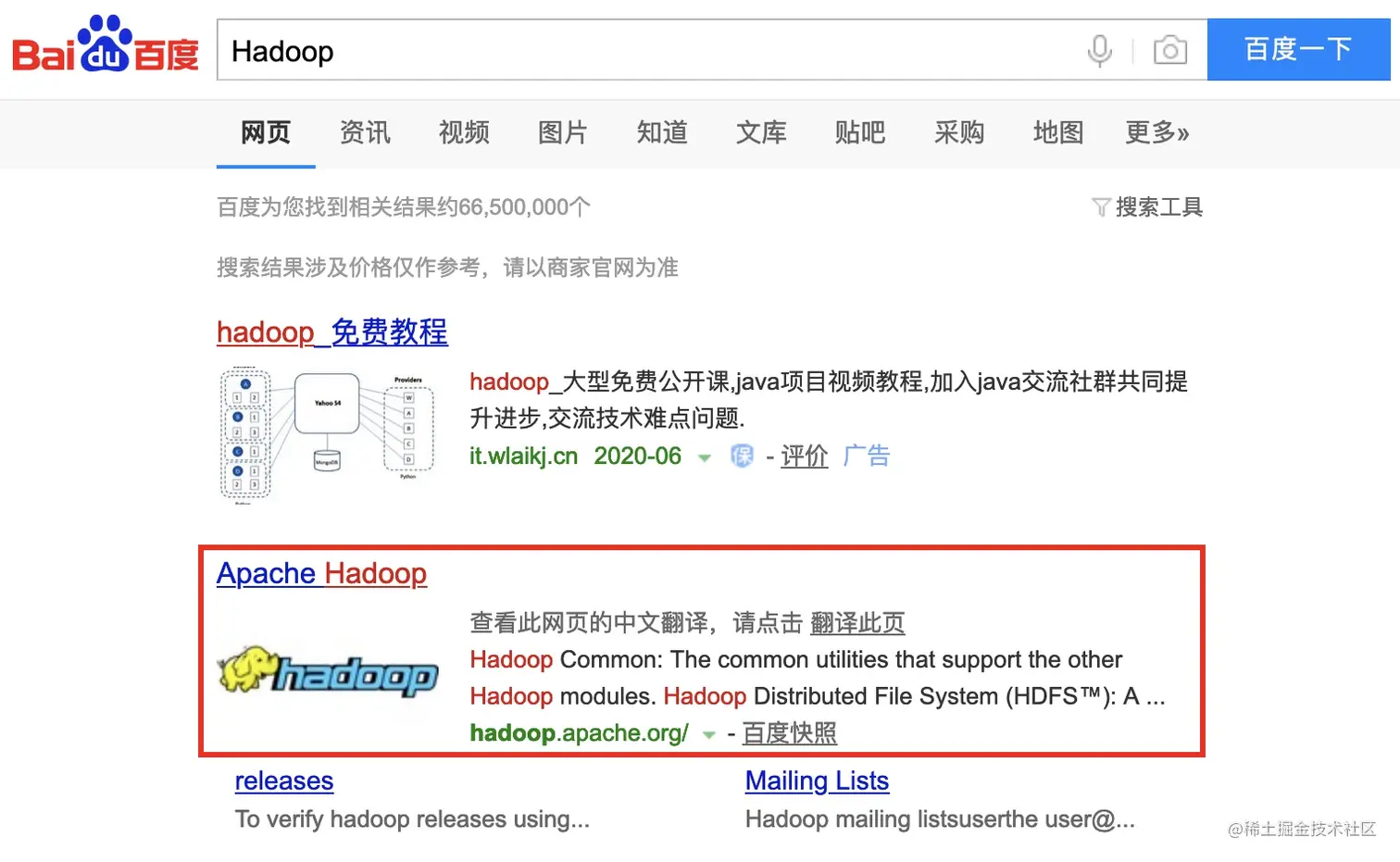在百度中搜索Hadoop,前两条就会显示我们需要的网站,目前Hadoop属于Apache基金会,所以我们打开网址时注意一下是apache.org。