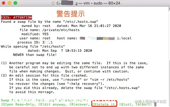 通过上述错误描述,可以很直观的看到解决这个错误的方法,有两个解决方法,本案例是基于Mac电脑系统下的终端为例来解释说明的。造成这个原因的出现也是由于在编辑该文件的时候异常退出了,因为vim在编辑文件的时候会创建一个交换文件来保证文件的安全性,为了去掉这个警告提示,只用删除该文件即可。具体操作如下所示: