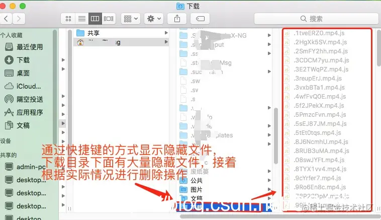 3、在含有占据电脑存储空间较大的文件夹下,使用快捷键组合:”shift+command+. “,即可看到该文件夹下的所有以.开头的隐藏文件,然后根据实际情况进行删除处理;