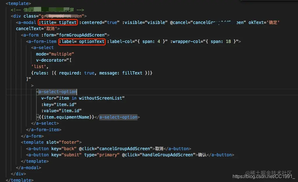 <a-modal :title= tipText :centered="true" :visible="visible" @cancel="cancelGroupAddScreen" okText='确定'