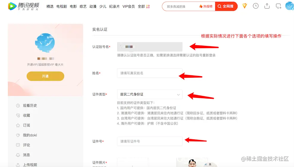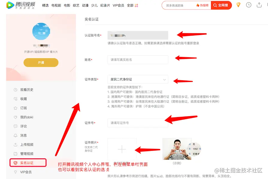 3、在腾讯视频的个人中心里面,找到左侧菜单栏里面的实名认证选项也可以进入,然后根据实际情况进行实名认证的各个选项的填写操作。