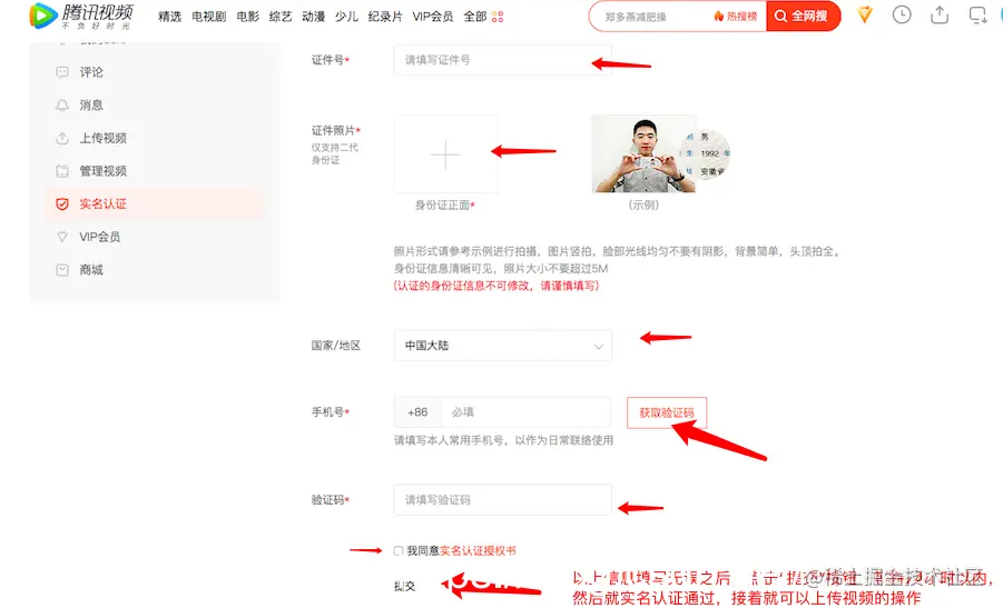 4、填写实名认证需要填写的信息之后,勾选实名认证授权书,然后点击“提交”按钮即可,然后就等待审核结果,一般情况下在24小时以内就可以知道审核结果。如果实名认证审核通过之后,直接在腾讯视频里面进行上传视频操作,最后再应用宝里面选择即可。